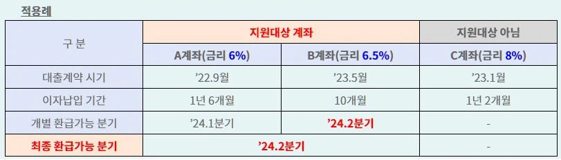 지원대상 계좌 중 이자의 1년 치 이상 납임이 되지 않은 경우에는 1년 치 이자가 모두 납입되는 시기가 돼야 환급이 진행됩니다. 차주는 신청 전에 본인의 지원 대상 계좌의 이자를 1년 치 이상 납입됐는지 확인해야 합니다.