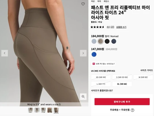 룰루레몬 공식 홈페이지 기준 18만 4000원에 판매되고 있으며, 전종서가 착용한 후 카키색 레깅스는 XS부터 L 사이즈까지 일시 품절 상태를 기록했습니다.