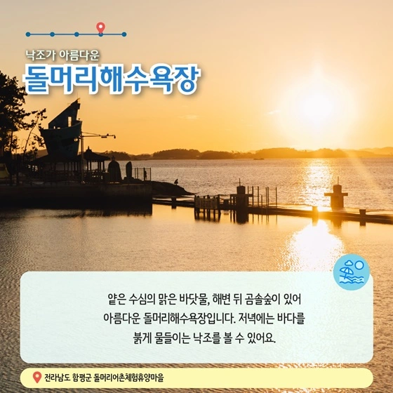 전남 함평에 위치한 돌머리어촌체험휴양마을은 소나무 숲과 하얀 모래사장, 드넓게 펼쳐진 갯벌이 한데 어우러져 있어 마치 그림 같은 풍경을 자랑합니다.
