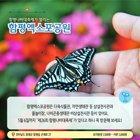 5월 초까지 열리는 함평 나비대축제를 놓치지 마세요. 축제는 함평엑스포공원에서 열리며 다육식물관, 나비곤충생태관 등 전시관을 함께 관람할 수 있습니다.