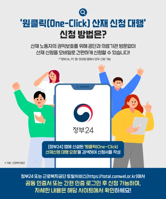 ▶신청방법: 정부24 앱 또는 PC 웹사이트에 접속 > '원클릭 산재신청 대행' 클릭 > 신청서 작성 > 공인인증서 또는 휴대폰 인증 본인 확인 > 신청 완료