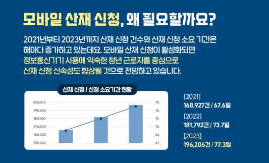 그동안 산재를 신청하려면 복잡한 과정을 거쳐야 했습니다. 현장 사고 발생 시 119나 사업장에 신고한 뒤 ▲산재 요양신청서 작성 ▲진단서 및 의무기록 발급받기 ▲관할 근로복지공단 방문 ▲담당자 상담 및 신청 접수 등 번거로운 단계를 밟아야 했죠.