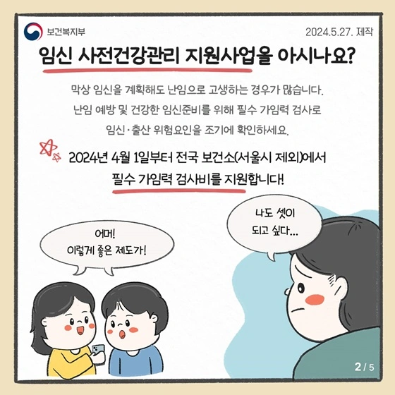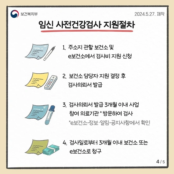 임신 사전건강관리의 중요성을 인식한 정부에서는 관련 검사비를 지원하는 사업을 시행 중입니다. 2024년 4월 1일부터 서울시를 제외한 전국 보건소에서 실시하고 있으며, 서울시의 경우 주소지 관할 보건소에 문의하시면 됩니다.