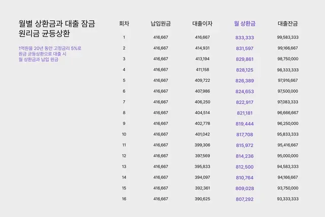 - 16회차: 원금 416,667원 + 이자 390,625원 = 807,292원 납부