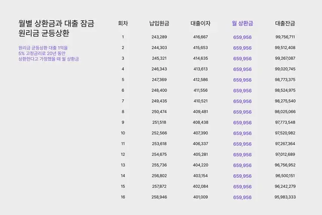 > 1억 원 대출, 20년 만기, 연 5% 고정금리 가정