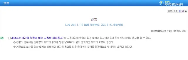 민법 제660조에 따르면, 고용 기간을 정하지 않은 경우 언제든 계약 해지를 통고할 수 있습니다. 하지만 이는 법적 최소 기준일 뿐, 실제로는 회사와 동료들을 배려하는 통보 기간을 갖는 것이 좋습니다.