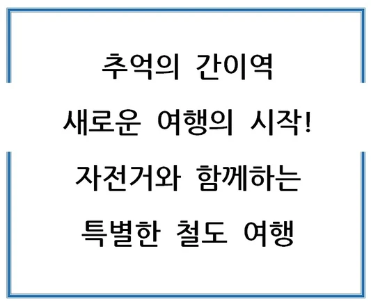 국토교통부와 한국철도공사가 선보이는 새로운 관광열차! 자전거를 싣고 떠나는 간이역 탐방, 전통시장을 연계한 순환열차, 그리고 복고풍 교외선까지. 특별한 철도 여행의 모든 것을 소개합니다.