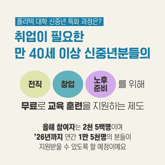 폴리텍대학 신중년 특화과정은 만 40세 이상 중장년층의 성공적인 인생 2막을 지원하는 국가 주도 무료 교육 프로그램입니다.