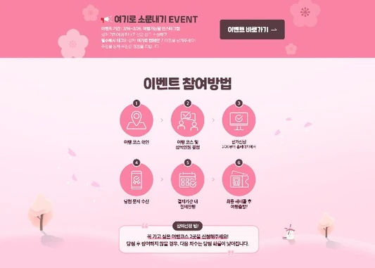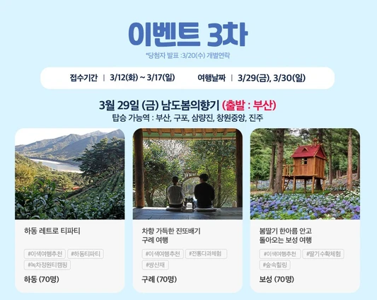 3차 이벤트는 3월 12일(화)부터 3월 17일(일)까지 접수하며 여행날짜는 3월 29일(금), 3월 30일(토)입니다. 당첨자는 3월 20일(수)에 개별 문자 연락합니다.