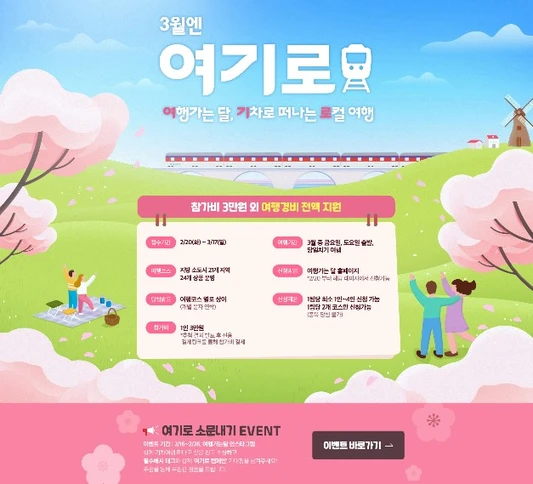 문화체육관광부, 한국관광공사가 관광업계, 지차제와 함께 국내여행을 통해 지역관광 활성화를 위해 만든 여행가는 달 홈페이지에서 3월엔 여기로(여행가는 달, 기차로 떠나는 로컬 여행) 이벤트를 실시합니다.