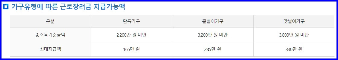근로장려금은 가구유형에 따라 지급이 됩니다. 총소득 기준금액 2,200만 원 미만 단독가구는 최대 165만 원, 3,200만 원 미만 홑벌이가구는 최대 285만 원, 3,800만 원 미만 맞벌이가구는 최대 330만 원이 지급됩니다.