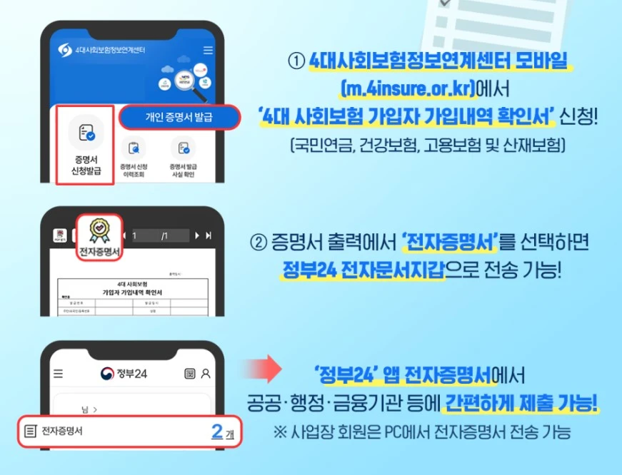 2024년부터 개인 4대 사회보험 증명서 발급이 모바일에서 가능하게 되었습니다. 발급신청은 4대 사회보험정보연계센터 모바일(m.4insure.or.kr)에서 신청할 수 있습니다. ‘개인 증명서 발급’ → ‘증명서 신청발급’ → ‘4대 사회보험 가입자 가입내역 확인서’를 신청한 후 증명서 출력화면에서 ‘전자증명서’를 선택하여 ‘정부24 전자문서지갑’으로 전송하면 됩니다.