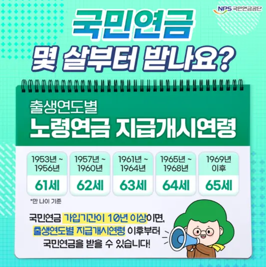 국민연금 노령연금은 가입기간이 10년 이상인 분들이 받을 수 있는 연금입니다. 이때, 노령연금을 받을 수 있는 나이는 본인의 출생연도에 따라 달라집니다. 지급개시연령 이후부터 평생 받을 수 있습니다. 아래의 표에서 본인의 출생연도에 따른 노령연금 지급개시연령을 확인해 보세요.